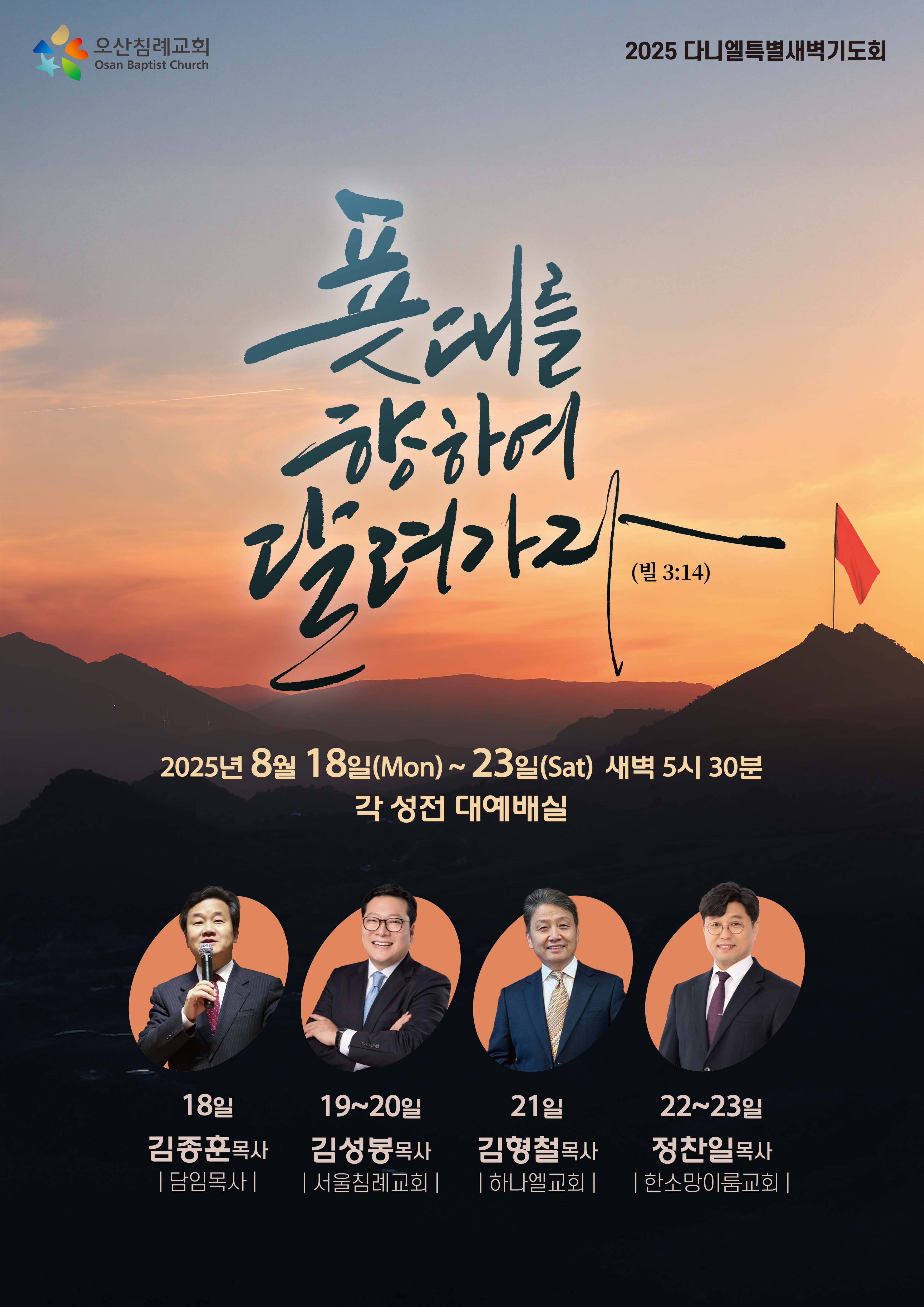 8월 18일(월)부터 23일(토)까지 6일간 "푯대를 향하여 달려가자"라는 주제로 진행된 다니엘 특별새벽기도회가 하나님의 은혜 가운데 마무리되었습니다.