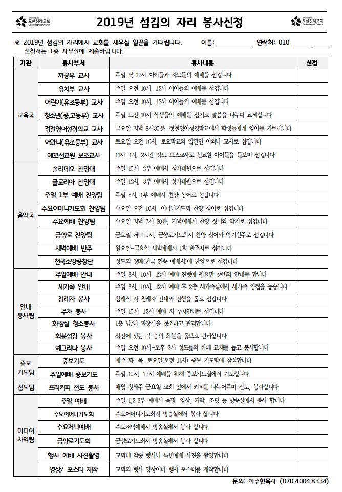 교회봉사신청은 교구사역자나 1층사무실을 통해서도 하실 수 있습니다.
